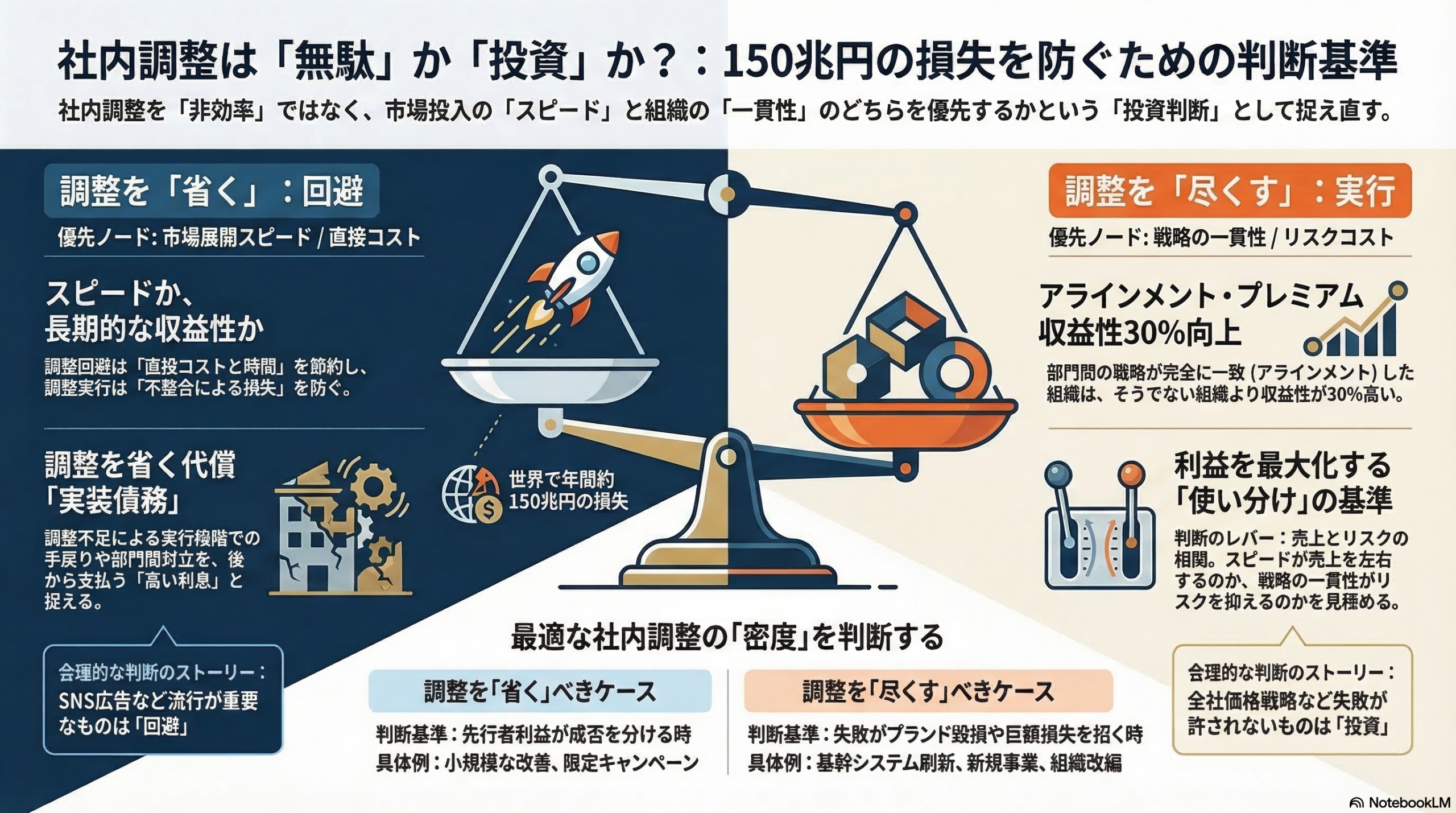 スピード経営が叫ばれる現代、社内調整は「非効率の象徴」として忌み嫌われています。確かに、調整を省けば人件費は浮き、意思決定は早まります。しかし、その代償として「150兆円の不整合損失」を招くリスクも孕んでいます。