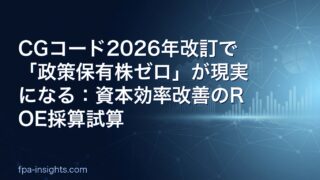 金融庁が2026年中に予定するコーポレートガバナンス・コード5年ぶり改訂で、政策保有株のゼロ化と資本効率改善が「義務」に近い水準へ引き上げられる。上場企業が30兆円超の政策保有株を放出した場合、ROEは平均何ポイント改善するか。経営企画担当者が今すぐ準備すべき感度分析の実務を解説する。