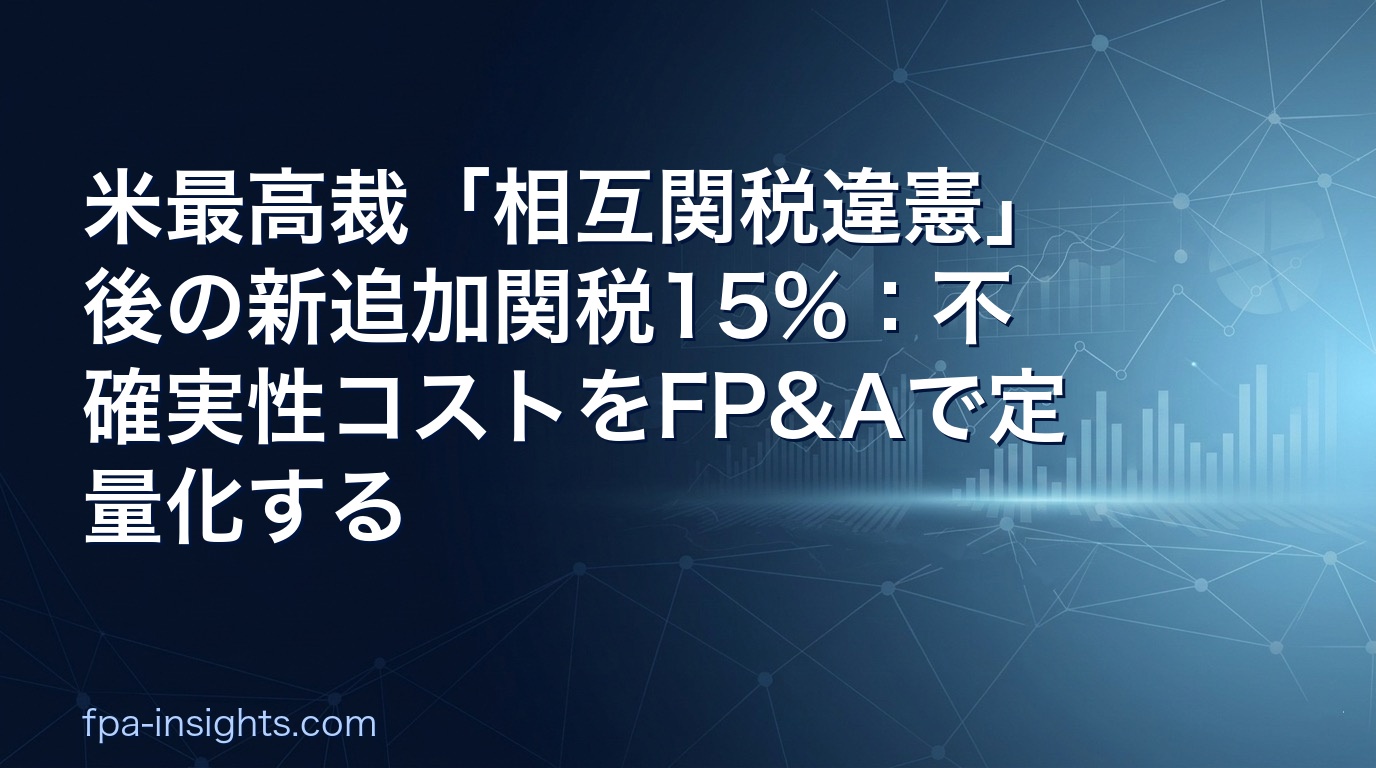 このシミュレーションが伝えるのは「現行15%が続いても利益インパクトは甚大だ」という現実だ。最高裁が違憲判断を下しても、関税という「コスト現実」は消えない。FP&Aが今すぐやるべきことは、このシナリオテーブルを最新の自社数値で埋め直し、経営層が判断できる状態を作ることだ。